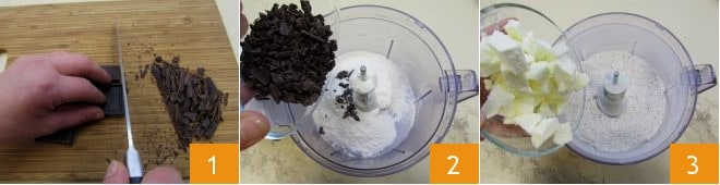 Um die knusprigen Sterne mit Schokolade und Zimt zuzubereiten, beginnen Sie damit, die Zartbitterschokolade zu hacken 1, und fügen Sie sie dann dem gesiebten Mehl in der Schüssel eines Mixers hinzu 2. Geben Sie auch die kalte, in Stücke geschnittene Butter dazu 3;
