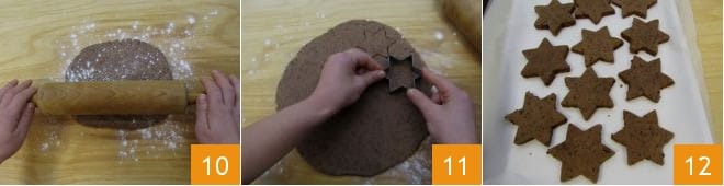 Nach der erforderlichen Zeit rollen Sie den Block auf einer leicht bemehlten Arbeitsfläche auf etwa 1 cm Dicke aus 10. Stechen Sie mit einem sternförmigen Ausstecher die Kekse aus dem Teig 11: Sie erhalten etwa 26 Stück, können den Rest des Teigs neu kneten, um ihn vollständig zu verbrauchen. Legen Sie sie auf ein mit Backpapier ausgelegtes Tablett und stellen Sie sie für 15 Minuten in den Kühlschrank, um sie zu festigen.
