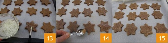 Dann legen Sie sie auf ein mit Backpapier ausgelegtes Backblech und bestreichen sie mit dem Eiweiß 13, dann bestreuen Sie sie mit Zucker, der mit gemahlenem Zimt aromatisiert ist 14, und backen Sie sie bei 150° für etwa 12-15 Minuten (130° für 8-10 Minuten, wenn Umluftofen. Sie können 1 oder 2 zur Probe backen, um die Zeit und Temperatur besser einzuschätzen). Einmal gebacken, nehmen Sie die knusprigen Schokoladen-Zimt-Sterne aus dem Ofen 15 und lassen Sie sie vollständig auf einem Gitter abkühlen, bevor Sie sie servieren!