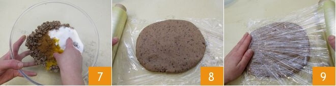 Verarbeiten Sie alle Zutaten schnell mit den Händen, um zu vermeiden, dass der Teig zu warm wird 7, formen Sie dann einen Block und drücken Sie ihn flach, um ihm eine ovale Form zu geben, und wickeln Sie ihn in Frischhaltefolie (8-9). Legen Sie ihn für mindestens 30 Minuten in den Kühlschrank, damit er fest wird.
