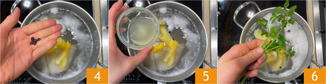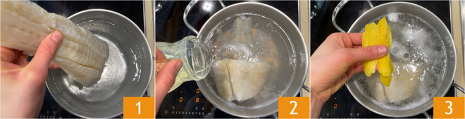 Um den Stockfischsalat zuzubereiten, bringen Sie zunächst einen Topf voller Wasser zum Kochen und tauchen das ganze Stockfischfilet ein 1. Fügen Sie den Weißwein hinzu 2 und die Zitronenschale 3.