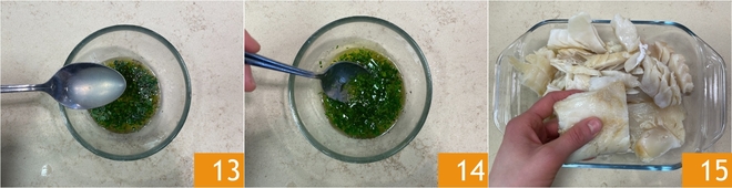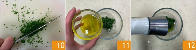 Gehen Sie zur Petersiliensoße über: Hacken Sie die Petersilie fein 10, geben Sie sie dann in ein Schälchen und fügen Sie das Öl 11, das Salz 12 und den Pfeffer hinzu.