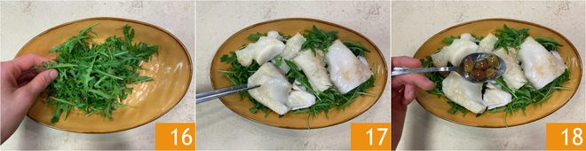 Sie sind bereit, den Salat zusammenzusetzen: Verteilen Sie ein Bett aus Rucola auf dem Servierteller 16, dann legen Sie den Stockfisch darauf 17 und verteilen die Taggiasca-Oliven 18.