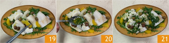 Fügen Sie auch die Orangenstücke hinzu 19 und schließlich beträufeln Sie alles mit der Petersiliensoße 20. Ihr Stockfischsalat ist bereit, genossen zu werden 21!