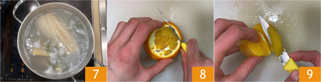 Kochen Sie etwa 35 Minuten lang 7. In der Zwischenzeit schälen Sie die Orangen, indem Sie die Schale entfernen 8 und die Fruchtfleischstücke ohne die weiße Haut gewinnen 9.