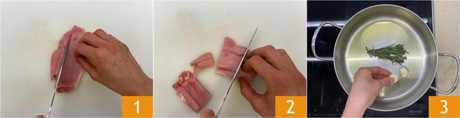 Um die Schweinefleischstreifen mit Bier zuzubereiten, schneiden Sie zuerst die Lende in Scheiben und dann in Streifen 1, um schließlich die Streifen 2 zu erhalten. Geben Sie in einen Topf das Olivenöl, Rosmarin und Knoblauch 3. Lassen Sie es bei schwacher Hitze aromatisieren.