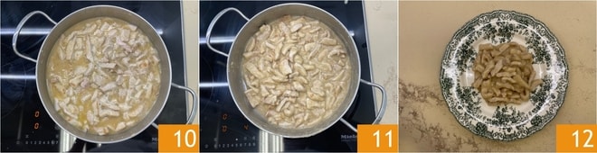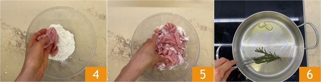 In der Zwischenzeit geben Sie das Mehl in eine Schüssel und fügen die Schweinestreifen hinzu 4, mischen Sie, um sie gut zu bemehlen 5. Nehmen Sie nun den Knoblauch und Rosmarin aus der Pfanne 6.