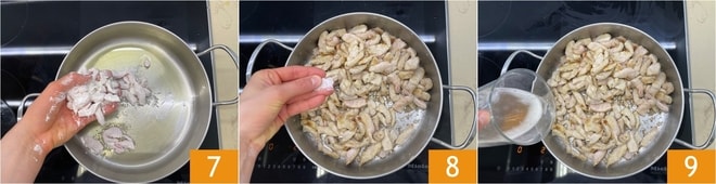 Entfernen Sie das überschüssige Mehl von den Streifen und geben Sie sie in den Topf 7. Salzen 8, gut anbraten und mit dem Bier ablöschen 9.