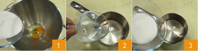 Um das Stracchino della Duchessa herzustellen, beginnen Sie mit der Zubereitung der Pâte à Bombe: Geben Sie die Eier und 40 Gramm Zucker 1 in die Schüssel einer Küchenmaschine mit Schneebesen und schlagen Sie die Zutaten auf, bis die Masse hell und schaumig ist. In der Zwischenzeit geben Sie das Wasser in einen Topf 2 und fügen den restlichen Zucker (110 Gramm) hinzu 3.