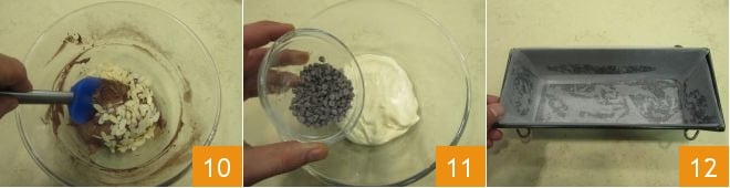 die Mandelblättchen 10 und der anderen die Zartbitterschokoladen-Tropfen 11. Fetten Sie eine Kastenform von 28 x 11 cm ein und legen Sie sie mit Backpapier aus 12.