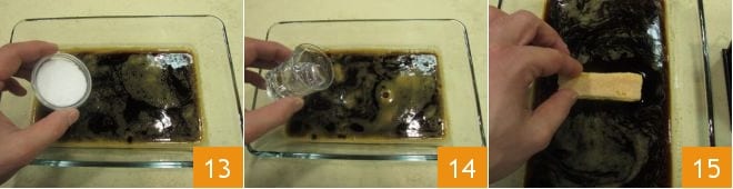 Bereiten Sie die Tränke vor: Bereiten Sie den Kaffee mit der Moka (ungefähr 6 Tassen), gießen Sie ihn in eine große Auflaufform, zuckern Sie nach Belieben 13 (je nach Geschmack), wenn er noch heiß ist, und fügen Sie den Rum hinzu 14. Wenn die Tränke vollständig abgekühlt ist, tauchen Sie die Savoiardi einzeln ein 15
