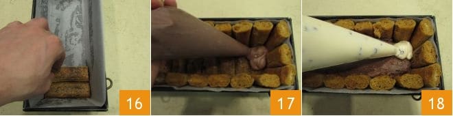 und legen Sie sie dann auf den Boden und die Ränder der Kastenform 16. Nehmen Sie die beiden Pâte à Bombe und füllen Sie sie in zwei Einweg-Spritzbeutel, dann machen Sie einen Schnitt an der Spitze und drücken Sie die dunkle Pâte à Bombe auf den Boden der Form 17 und dann die helle 18