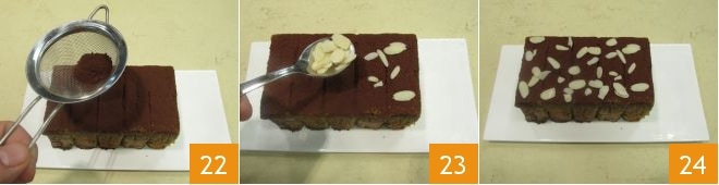 Bevor Sie das Stracchino della Duchessa schneiden, bestreuen Sie es mit ungesüßtem Kakaopulver 22 und Mandelblättchen 23. Ihr köstliches Stracchino della Duchessa ist bereit, serviert zu werden 24.