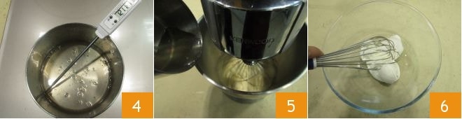 Stellen Sie den Topf auf den Herd und erhitzen Sie ihn auf 121° 4 (überwachen Sie die Temperatur mit einem Lebensmittelthermometer). Wenn der Sirup die angegebene Temperatur erreicht hat, gießen Sie ihn in einem dünnen Strahl in die Küchenmaschine, in der Sie die Eier mit dem Zucker aufgeschlagen haben 5. Schlagen Sie weiter mit dem Schneebesen, bis die Masse vollständig abgekühlt ist. In der Zwischenzeit geben Sie den Mascarpone in eine Schüssel 6,