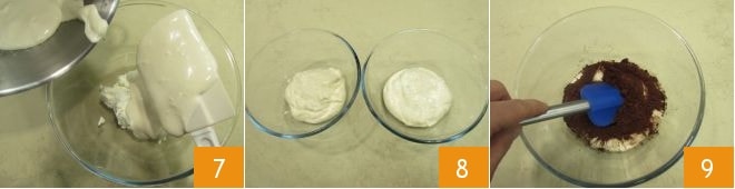 fügen Sie einen Esslöffel Pâte à Bombe hinzu 7 und rühren Sie, um die Massen zu vermischen. Dann heben Sie den Rest der Pâte à Bombe vorsichtig von unten nach oben unter. Teilen Sie die Masse in zwei Schüsseln 8: Fügen Sie der einen Hälfte das Kakaopulver hinzu 9
