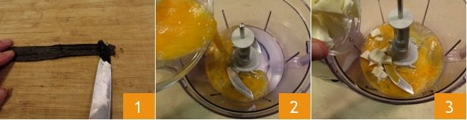 Um den Strahlen-Apfelkuchen zuzubereiten, beginnt damit, die Samen aus der Vanilleschote zu entnehmen: Schneidet sie der Länge nach auf und schabt das Mark mit der Messerklinge aus 1. Beiseite stellen, inzwischen gebt die kalten Eier 2, die kalte Butter in Stückchen 3 in einen Mixer.