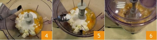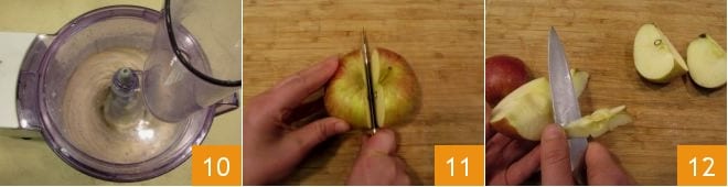 Mixt weiter, bis eine homogene und flüssige Masse entsteht 10. Dann kümmert euch um die Äpfel: Wascht und trocknet sie, teilt sie dann in der Mitte 11, danach in 4 Viertel; entfernt das Kerngehäuse 12, aber schält sie nicht.