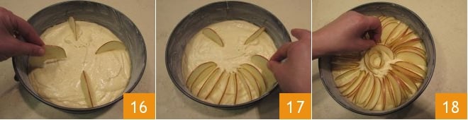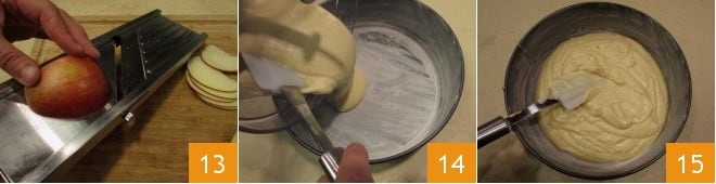 Mit einem Gemüsehobel schneidet ihr aus jedem Apfelviertel dünne Scheiben 13. Wenn ihr keinen Gemüsehobel habt, könnt ihr ein sehr scharfes Messer verwenden, um sehr dünne Scheiben zu schneiden. Fettet und mehlt eine Backform mit 24 cm Durchmesser ein. Dann gebt den Kuchenteig hinein 14 und glättet die Oberfläche mit einem Spatel 15 oder durch Drehen der Form auf der Arbeitsplatte, jedoch ohne sie zu schlagen, um zu vermeiden, dass Luft aus dem Teig entweicht, was die Hefe und das Backen beeinträchtigen könnte.