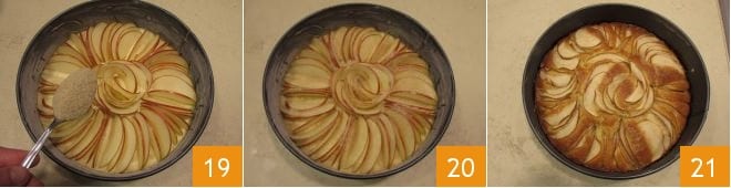 Bestreut die Oberfläche des Apfelkuchens mit Rohrzucker 19; sobald er fertig ist 20, backt ihn im vorgeheizten statischen Ofen bei 180° für 50 Minuten im untersten Einschub. Sobald er gebacken ist, holt ihn aus dem Ofen 21, lasst ihn leicht abkühlen, dann stürzt ihn und serviert euren Strahlen-Apfelkuchen, wenn ihr mögt, mit einer Kugel Vanilleeis!