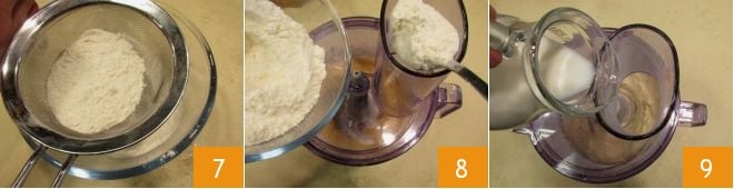 Siebt das Mehl und das Backpulver in eine Schüssel 7, dann gebt die trockenen Zutaten allmählich bei laufendem Mixer hinzu 8, abwechselnd mit der Milch 9.