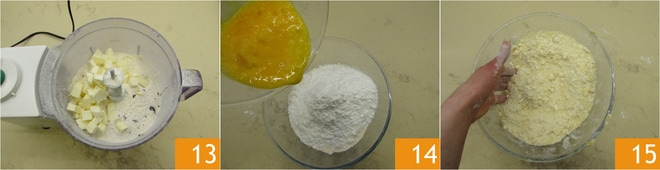 Fügen Sie die Samen einer Vanilleschote, eine Prise Salz und die Butter hinzu 13. Schalten Sie die Küchenmaschine ein, um kurz zu vermischen. Geben Sie die Mischung in eine Schüssel, fügen Sie die geschlagenen Eier hinzu 14. Kneten Sie schnell mit den Händen, indem Sie versuchen, den Teig zu kneifen 15.