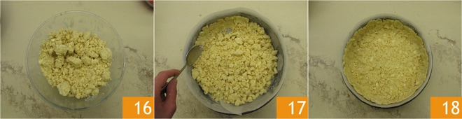 Sie sollten eine krümelige Mischung erhalten 16. Decken Sie die Schüssel mit Frischhaltefolie ab und lassen Sie sie eine Stunde im Kühlschrank ruhen. Legen Sie eine Springform mit einem Durchmesser von 24 cm mit Backpapier aus, sodass das Papier einige cm über den Rand der Form hinausragt. Verteilen Sie 2/3 des Mürbeteigs auf dem Boden 17, indem Sie die Krümelstruktur beibehalten, formen Sie die Ränder (hoch bis zur Grenze der Form), indem Sie den Teig leicht mit einem Löffel zusammendrücken 18.