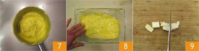 Geben Sie die fertige Creme 7 in einen langen und breiten Behälter oder eine große Schüssel 8, legen Sie Frischhaltefolie direkt darauf und lassen Sie sie bei Raumtemperatur abkühlen. Schneiden Sie die Butter für den Boden in Würfel 9.