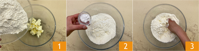 Um den Streuselkuchen mit Marmelade zuzubereiten, gebt die kalte Butter in Würfeln, das Mehl 1 und das Backpulver 2 in eine Schüssel, und beginnt, die Mischung mit den Händen zu zerbröseln 3.