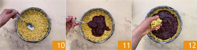 Verdichtet den Boden mit den Händen oder der Rückseite eines Löffels 10 und formt auch den Rand. Verteilt die Marmelade 11 und bedeckt sie mit den restlichen Krümeln 12.