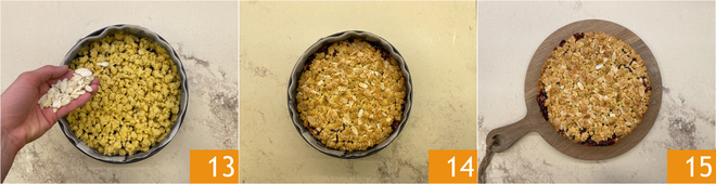 Ihr müsst die gesamte Oberfläche bedecken, daher verteilt die Mandelblättchen 13. Backt es im vorgeheizten statischen Ofen bei 180° für etwa 60 Minuten.