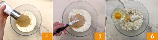 Fügt den Zucker, eine Prise Salz 4 und die Vanillesamen 5 hinzu. Zum Schluss die Eier 6 einarbeiten.