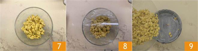 Fahrt fort, die Mischung zu zerbröseln, um grobe Krümel zu formen 7, bedeckt sie mit Frischhaltefolie und stellt sie für 1 Stunde in den Kühlschrank 8. Legt eine Springform mit 22 cm Durchmesser mit Backpapier aus und gebt 2/3 des Teigs hinein 9.