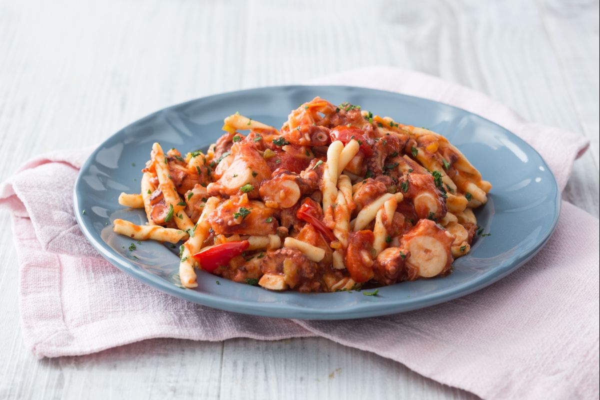 Die Strozzapreti mit Oktopussoße sind ein sehr schmackhaftes Fischgericht, das auch als Hauptgericht für ein Fischessen oder ein Fischabendessen geeignet ist. Besorgen Sie sich einen ganz frischen Oktopus und verwenden Sie ihn, um eine Spaghetti mit Tintenfischsauce wie diese zu machen, die wir Ihnen vorschlagen. Die Zartheit des Oktopus passt perfekt zur Tomatenpassata, die mit Thymian aromatisiert ist und sich mit dieser besonderen Strozzapreti verbindet, um einzigartige Aromen freizusetzen. Die Strozzapreti mit Oktopussoße sind ein ganz mediterranes Rezept, inspiriert vom klassischen geschmorten Oktopus, da genau in diesem Meer der Oktopus viel gefangen und konsumiert wird.