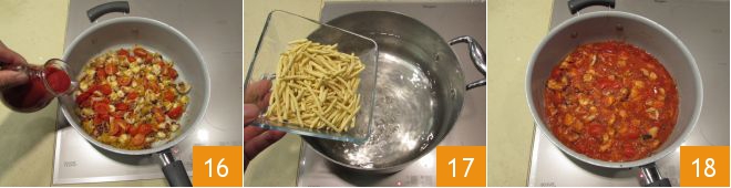 Fügen Sie auch die Tomatenpassata hinzu 16 und lassen Sie sie bei sehr schwacher Hitze 10-15 Minuten köcheln. In der Zwischenzeit kochen Sie die Pasta in einem Topf mit reichlich Salzwasser 17. Nach der erforderlichen Zeit wird auch das Oktopus-Ragout fertig sein 18. Würzen Sie mit Salz und Pfeffer.