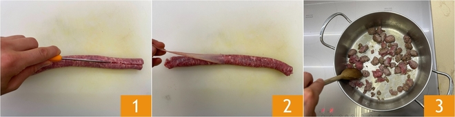 Für die Zubereitung des Filoteig-Strudels mit Salsiccia und Spinat schneiden Sie zuerst die Salsiccia der Länge nach ein 1 und entfernen den Darm 1. In einer Pfanne etwas Öl erhitzen und die krümelig zerteilte Salsiccia dazugeben 3.