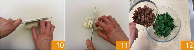 Den fädenziehenden Käse zuerst in Stäbchen schneiden 10 und dann in Würfel 11. In einer Schüssel Spinat und Salsiccia vereinen 12.
