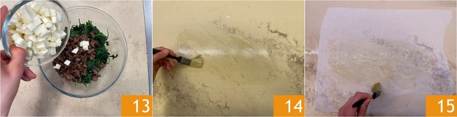 Vervollständigen Sie die Füllung mit den Käsewürfeln 13 und mischen Sie alles. Bestreichen Sie die Arbeitsfläche mit Öl 14, dann legen Sie ein Backpapierblatt so aus, dass es gut haftet. Bestreichen Sie auch das Backpapier mit Öl 15.