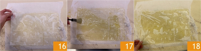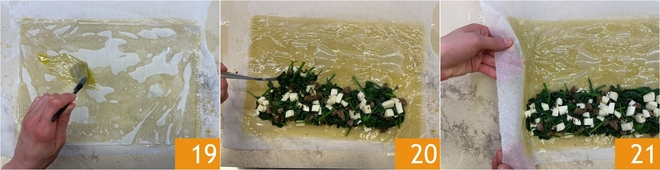 Leg(en) Sie das erste Filoteigblatt darauf 16 und bestreichen Sie es mit Öl 17, dann legen Sie ein zweites Filoteigblatt darauf 18 und drücken es gut an.