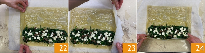 Fahren Sie so mit allen 6 Filoteigblättern fort. Bestreichen Sie die oberste Schicht mit Öl 19 und füllen Sie die untere Hälfte mit der Füllung, wobei Sie einen freien Rand lassen 20. Nun den Teig verschließen: Heben Sie das Backpapier an, um die kurze Seite leicht umzuklappen 21.