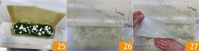 Klappen Sie den Filoteig darüber 25, sodass eine Rolle entsteht, die vom Backpapier umhüllt ist 26. Nun das Backpapier vorsichtig abrollen 27.