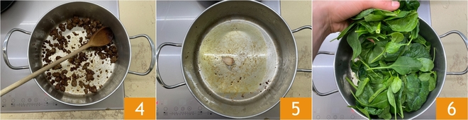 Die Salsiccia goldbraun anbraten 4, dann in eine Schüssel geben. In derselben Pfanne etwas zusätzliches Öl mit einer Knoblauchzehe erhitzen 5, dann die Spinatblätter hinzufügen 6.