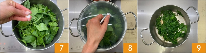 Salzen 7, den Deckel aufsetzen 8 und bei mittlerer Hitze etwa 3 Minuten weitergaren, bis der Spinat weich ist. Danach den Deckel abnehmen und noch etwa eine Minute weitergaren, damit er etwas trocknet 9.