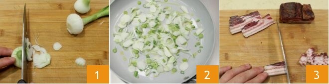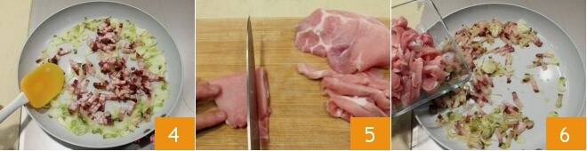 und fügen Sie ihn dann zu den Frühlingszwiebeln hinzu 4 und braten Sie ihn gut an. Schneiden Sie das Schweinefilet in Streifen 5 und fügen Sie es den Frühlingszwiebeln und dem Speck hinzu, bis es goldbraun ist 6.