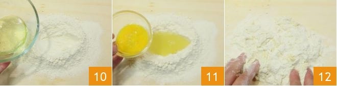 und fügen Sie dann das Öl hinzu und vermischen Sie die entstandene Mischung mit dem Mehl 10. Fügen Sie auch das verquirlte Ei hinzu 11 und kneten Sie die Zutaten 12.