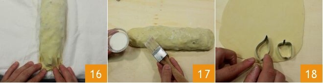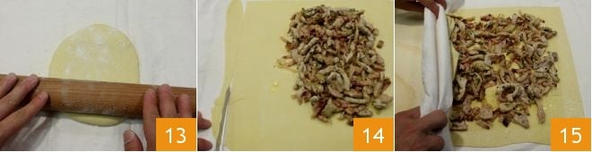 Wenn Sie einen homogenen und elastischen Teig erreicht haben, rollen Sie ihn mit einem Nudelholz auf einem Geschirrtuch aus 13, das zum Aufrollen des Strudels dient. Rollen Sie einen Teig aus, der 2-3 mm dick und etwa 40 x 40 cm groß ist. Verteilen Sie die abgekühlte Mischung darauf, bis zu 2-3 cm vom Rand entfernt, und schneiden Sie das Quadrat mit der Messerspitze zu, um eine regelmäßigere Form zu erhalten 14. Befeuchten Sie nun die Ränder mit Wasser und rollen Sie den Strudel mit Hilfe des Geschirrtuchs auf 15.