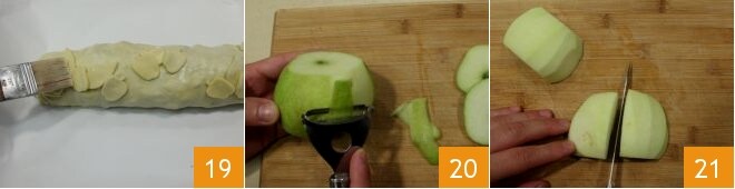 verteilen Sie diese dann auf dem Strudel und bestreichen Sie alles nochmals mit Milch 19. Backen Sie ihn im vorgeheizten Ofen bei 200° für 30 Minuten (bei Umluft 180° für 20 Minuten) auf der mittleren Schiene, bis er eine schöne goldene Farbe hat. In der Zwischenzeit kümmern Sie sich um die Beilage. Schälen Sie den Apfel, entfernen Sie das Kerngehäuse 20 und schneiden Sie ihn dann in Spalten 21.