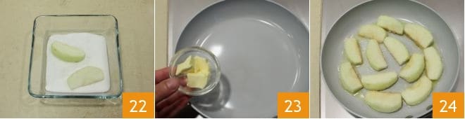 Geben Sie nun den Zucker in eine Schüssel und ziehen Sie die erhaltenen Spalten von beiden Seiten durch 22. Lassen Sie in einem Topf die Butter sanft schmelzen 23 und fügen Sie dann die gezuckerten Äpfel hinzu 24 und verteilen Sie sie ordentlich. Lassen Sie sie auf beiden Seiten goldbraun werden.