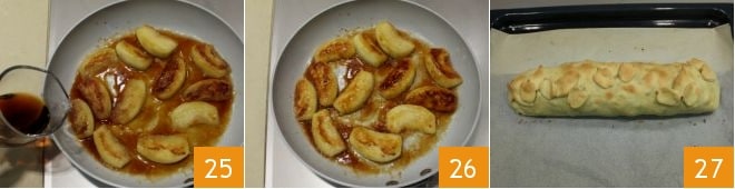 Befeuchten Sie sie nun mit Marsala 25 und lassen Sie ihn verdunsten, achten Sie darauf, dass er trocknet, ohne zu verbrennen 26. Nehmen Sie schließlich den Strudel aus dem Ofen, den Sie ganz oder in Scheiben servieren können, begleitet von den warmen Äpfeln 27.