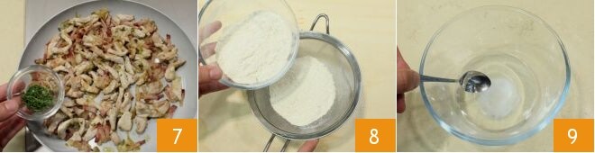 Mit Salz und Pfeffer würzen und abschließend den Thymian hinzufügen 7. Lassen Sie die Füllung in einer Schüssel abkühlen. Fahren Sie mit der Zubereitung des Strudelteigs fort. Sieben Sie das Mehl auf eine Arbeitsfläche und formen Sie eine typische Mulde mit einer Vertiefung in der Mitte 8. Lösen Sie das Salz im Wasser auf 9