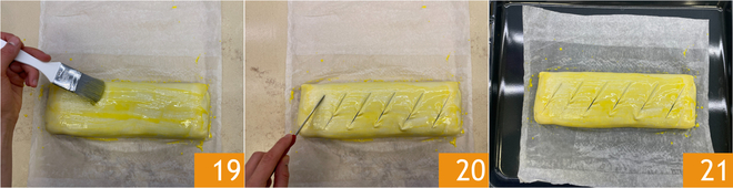 Bestreichen Sie die Oberfläche des Strudels mit der Milch-Ei-Mischung 19. Schneiden Sie die Oberfläche des Strudels ein 20 und legen Sie den Strudel auf ein Backblech 21. Im vorgeheizten Umluftofen bei 190 Grad für etwa 25 Minuten backen, oder bis eine gleichmäßige Bräunung erreicht ist.